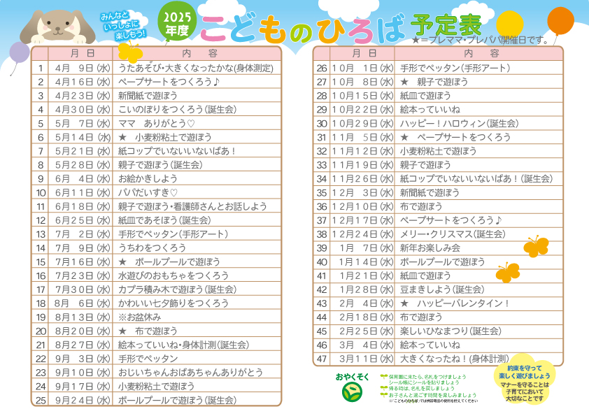 季節に応じた遊びを取り入れたり、家庭でも楽しめるような簡単な遊びを紹介しています。